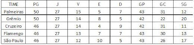 Apesar do jogo ruim, o empate fora de casa foi suficiente para o Verdão assumir a ponta. Com 50 pontos, o Palmeiras igualou-se ao ex-líder Grêmio, mas é o time com mais vitórias na competição, primeiro critério de desempate. Aliás, esse é o critério que uso para justificar o meu apontamento para os favoritos ao título.